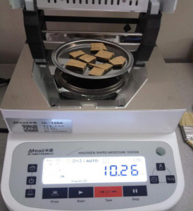 測試樣品:剪取2克紙皮,置于不銹鋼托盤(pán)中,將紙皮平鋪均勻,溫度設置120℃用儀器進(jìn)行加熱,約5分鐘后檢測結束,檢測數據顯示10.26%;