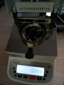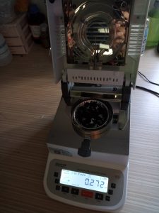 為了使測試過(guò)程中電池粉末水分儀將電池粉末烘干烘透,我們將電池粉末分散開(kāi)來(lái),以便溫度能滲透進(jìn)電池粉末內部。取7克多電池粉末撒于不銹鋼托盤(pán)中,用鑷子將電池粉末平鋪均勻,為避免電池粉末經(jīng)過(guò)高溫度加熱后變性,我們將溫度設置在140℃,按“START”鍵開(kāi)始測試,2分10秒后檢測結束,檢測數據顯示272%;