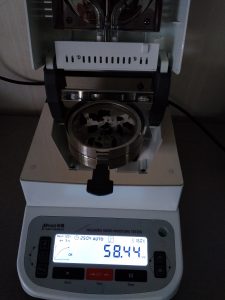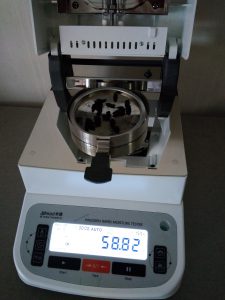 為了得到更精確穩定的數據結梅,在進(jìn)行第二次測試過(guò)程前先等待話(huà)梅干水分儀降溫,待儀器本身溫度降至40度以下時(shí),同樣取3克話(huà)梅干碎于不銹鋼托盤(pán)中,將話(huà)梅干碎平鋪均勻,這次我們把溫度設定在160℃,按“START”鍵開(kāi)始測試,30分08秒后檢測結束,檢測數據顯示58.82%;