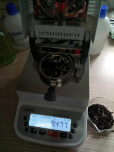 - 測(cè)試茶葉片:為了使測(cè)試過(guò)程中茶葉水分儀將茶葉烘干烘透,我們將茶葉攤成分散狀,以便溫度能滲透進(jìn)去。取2克茶葉片絲置于不銹鋼托盤中,用鑷子將茶葉片絲平鋪均勻,為避免茶葉烘烤后變焦,我們將溫度設(shè)置在135℃,按“START”鍵開始測(cè)試,5分28秒后檢測(cè)結(jié)束,檢測(cè)數(shù)據(jù)顯示9.477%;
