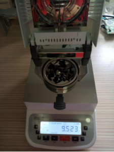 - 為了得到更精確穩(wěn)定的數(shù)據(jù)結(jié)果,在進(jìn)行第二次測(cè)試過(guò)程前先等待茶葉水分儀降溫,待儀器本身溫度降至40度以下時(shí),同樣取2克茶葉片絲于不銹鋼托盤中,將茶葉片絲平鋪均勻,這次我們把溫度設(shè)定在135℃,按“START”鍵開始測(cè)試,5分28秒后檢測(cè)結(jié)束,檢測(cè)數(shù)據(jù)顯示9.523%;