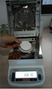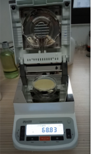 二、儀器本身有個(gè)自動(dòng)降溫過(guò)程,為求得數據的準確性,故在進(jìn)行第二次測量的時(shí)候先等待幾分鐘,使儀器顯示溫度為40度以下時(shí)再進(jìn)行第二次測量,這次我們加大膠水樣品量為7.025克,將膠水均勻滴于鋁箔盤(pán)上,溫度照樣設定在120℃,按“START”鍵開(kāi)始進(jìn)行測試,由于這次的膠水量比較多,所以?xún)x器此次用了17分鐘43秒才測試結束,測試結果數據顯示31.17%(含水率),按“單位鍵”切換其顯示數據,則屏幕顯示其固含量為68.83%。