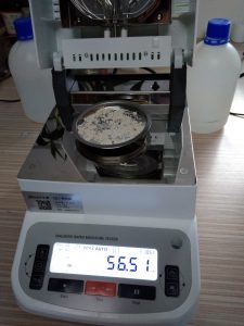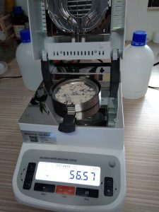 - 測試樹(shù)脂顆粒:倒出4克左右樹(shù)脂料顆粒倒在不銹鋼托盤(pán)中,為了使測試過(guò)程中樹(shù)脂水分儀將樹(shù)脂料烘干烘透,我們將樹(shù)脂顆粒攤成分散狀,以便溫度能滲透進(jìn)樹(shù)脂內部。用鑷子將樹(shù)脂顆粒平鋪均勻,為避免樹(shù)脂顆粒烘烤后變焦變黑,我們將溫度設置在105℃,按“START”鍵開(kāi)始測試,15分07秒后檢測結束,檢測數據顯示56.57%;