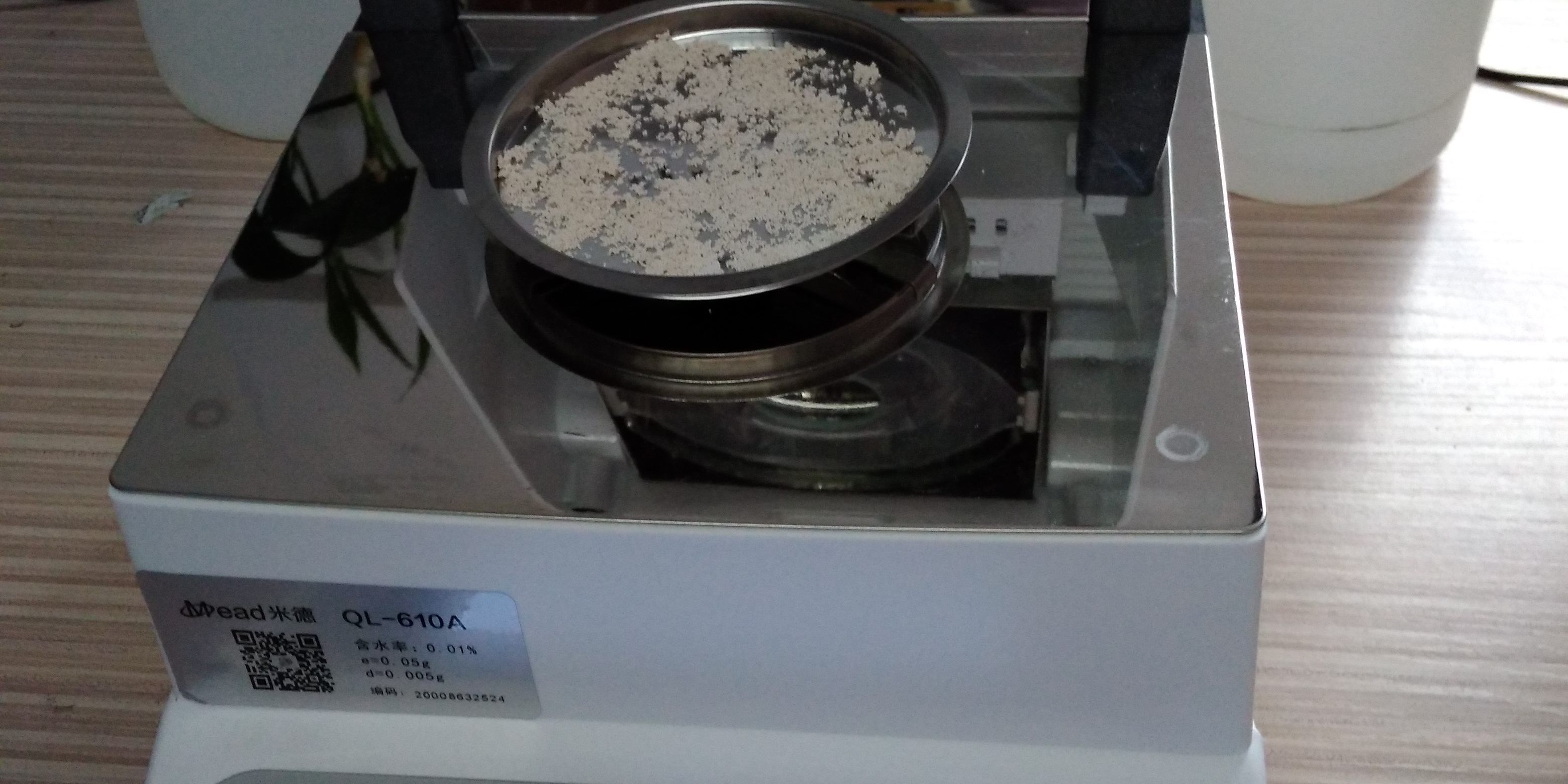 - 為了得到更精確穩定的數據結果,在進(jìn)行第二次測試過(guò)程前先等待樹(shù)脂水分儀降溫,待儀器本身溫度降至40度以下時(shí),同樣取4克左右樹(shù)脂料顆粒于不銹鋼托盤(pán)中,將樹(shù)脂顆粒平鋪均勻,這次我們把溫度設定在105℃,按“START”鍵開(kāi)始測試,14分43 秒后檢測結束,檢測數據顯示56.51%;