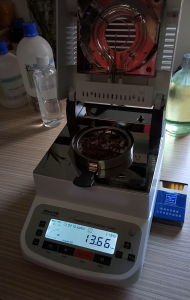- 為了得到更精確穩定的數據結果,在進(jìn)行第二次測試過(guò)程前先等待煙絲水分儀降溫,待儀器本身溫度降至40度以下時(shí),同樣取6克煙絲細條于不銹鋼托盤(pán)中,將煙絲細條平鋪均勻,這次我們把溫度設定在135℃,按“START”鍵開(kāi)始測試,2分10秒后檢測結束,檢測數據顯示13.66%;