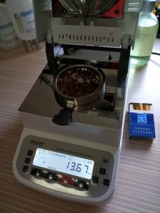 - 測試煙絲細條:取6克煙絲細條置于不銹鋼托盤(pán)中,為了使測試過(guò)程中煙絲水分儀將煙絲烘干烘透,我們將煙絲攤成分散狀,以便溫度能滲透進(jìn)煙絲內部。用鑷子將煙絲細條平鋪均勻,為避免煙絲烘烤后變焦,我們將溫度設置在135℃,按“START”鍵開(kāi)始測試,2分08秒后檢測結束,檢測數據顯示13.67%;