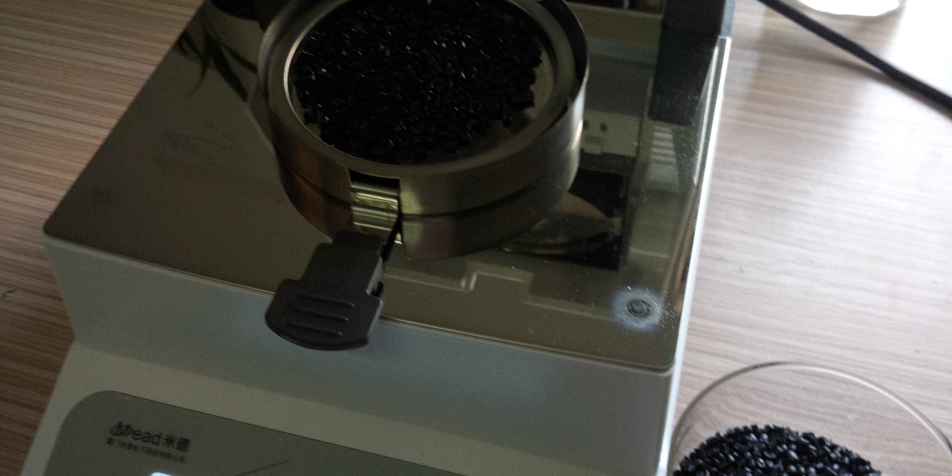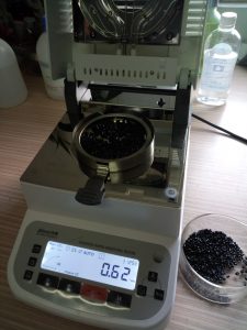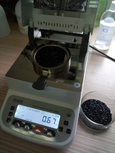- 測試再生尼龍顆粒:倒出8克左右再生尼龍料顆粒倒在不銹鋼托盤(pán)中,為了使測試過(guò)程中再生尼龍水分儀將再生尼龍料烘干烘透,我們將尼龍顆粒攤成分散狀,以便溫度能滲透進(jìn)再生尼龍內部。用鑷子將再生尼龍顆粒平鋪均勻,為避免尼龍顆粒烘烤后變焦變黑,我們將溫度設置在125℃,按“START”鍵開(kāi)始測試,5分40秒后檢測結束,檢測數據顯示0.67%;