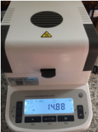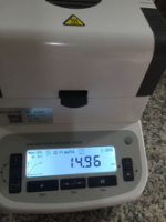 測試樣品2:為了檢測儀器的精確性,待儀器溫度降至50℃以下時(shí)進(jìn)行第二次測試,用實(shí)驗勺提取5.5克飼料,置于不銹鋼托盤(pán)中,用實(shí)驗藥勺將飼料平鋪均勻,溫度設置135℃用儀器進(jìn)行加熱,約15分鐘后檢測結束,檢測數據顯示14.88%;