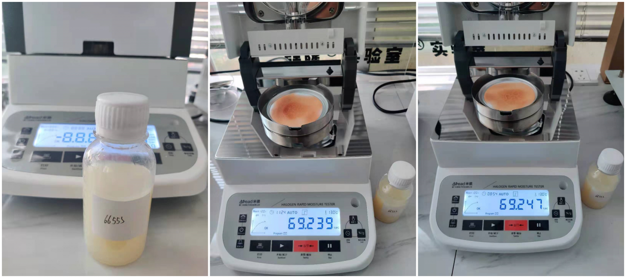 7、重復上述步驟,繼續(xù)測試溶液3,測得溶液3兩次測試的固含量結果為15.458%和15.465%,誤差為0.007%。