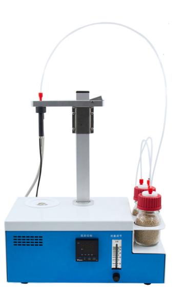 8、右下角是溫度調節及氣體流量調節,溫度0-300℃可調氣流0-100ml可調,適合各種水分釋放速度的樣品